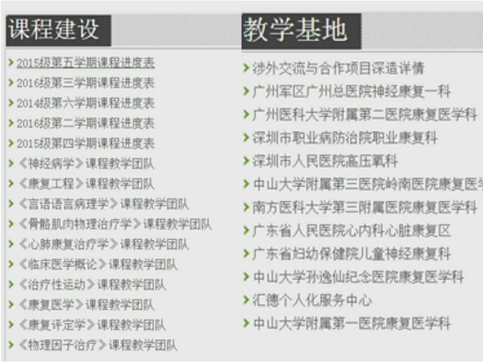 此外,建立了包括中山大学附属第一医院、中山大学孙逸仙纪念医院、南方医科大学珠江医院、深圳市人民医院、暨南大学附属第一医院、广州医科大学附属第一医院、佛山市第一人民医院、广州市妇女儿童医疗中心、广州市第一人民医院、广东省中医院、广东省残疾人康复中心等校外实习实践教学基地。