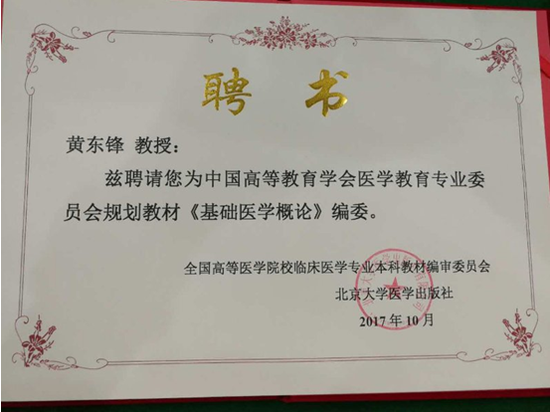 中山大学新华学院3044永利主任黄东锋教授当选中国高等教育学会医学教育专业委员会规划教材《基础医学概论》编委