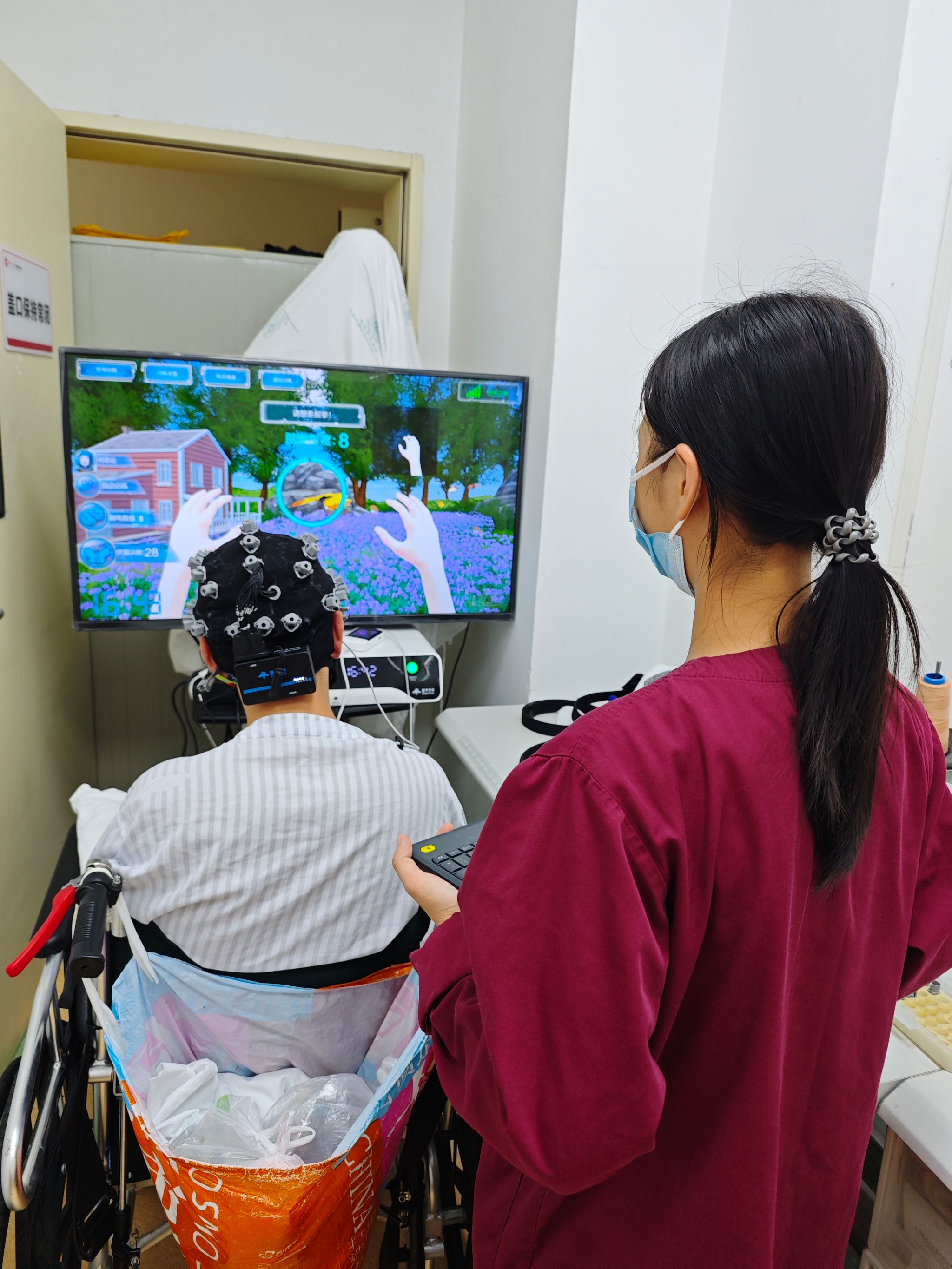 我系师生在中山七院康复医学科的脑机接口康复应用实践操作。