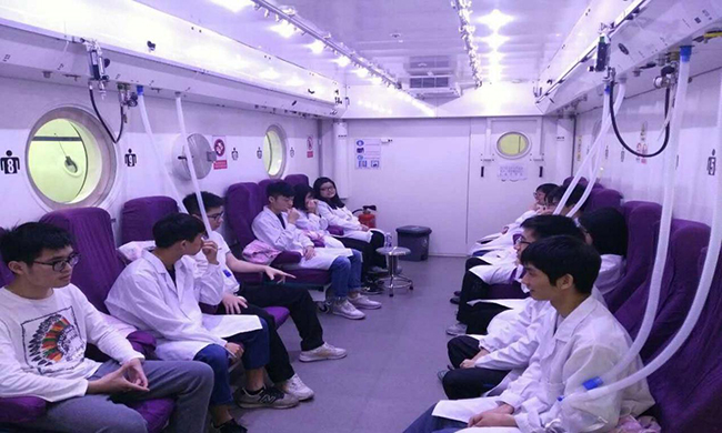 在为期一个月的见习过程中,同学们在老师的带领下,熟悉了多人空气加压舱的操作台,了解了各种仪表仪器的作用,在多人空气加压舱进行了升压训练,实际感受了压力,并在深圳市人民医院龙颖主任医师的带领下,从各方面了解高压氧舱的构造,把在学校学习到的理论与这次实践相结合,加深了对高压氧舱的认识。