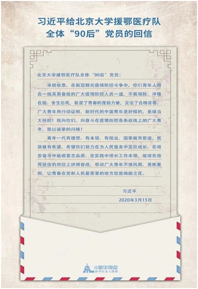 2020年3月15日,习近平总书记给北京大学援鄂医疗全队“90后”党员回信,向他们和奋斗在疫情防控各条战线上的广大青年致以诚挚的问候。