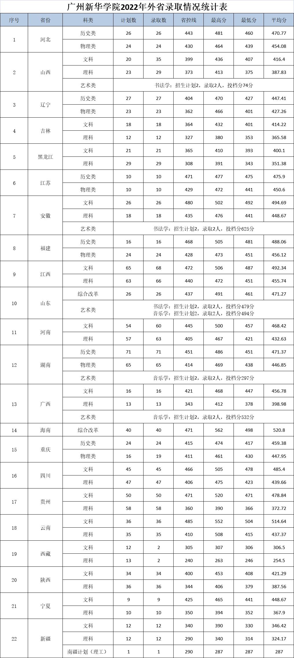 2022年外省录取情况统计表