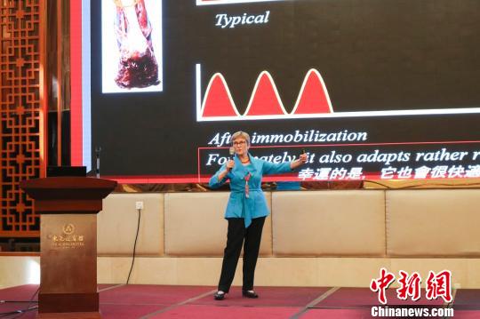 中美康复教育高峰论坛17日-18日在广东东莞举办,图为美国骨科人工物理治疗师学院八个创始成员之一Kornelia Kulig教授作专题演讲。